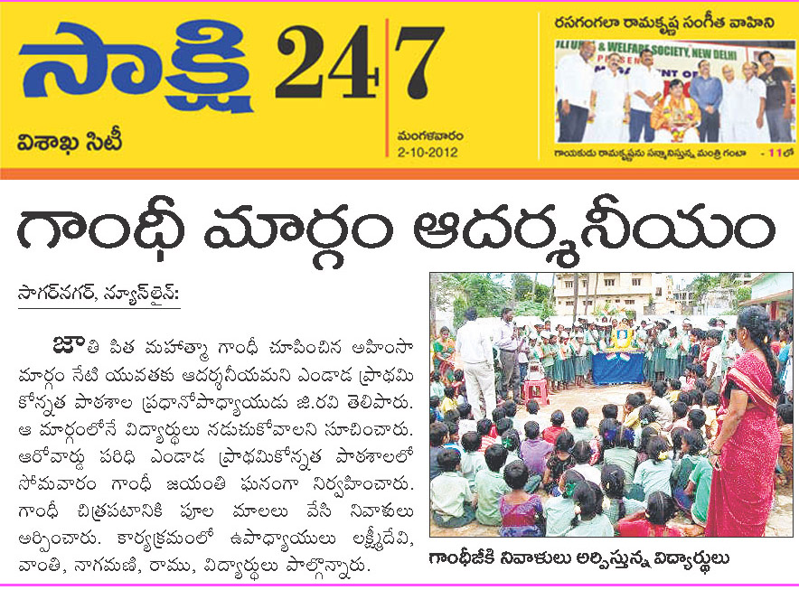 Mahatma Gandhi jayanthi celebrated in MPUP School Yendada today. Headmaster G.Ravi garlanded the picture of Gandhiji. Kum Bhagya of 5th Class described the life story of Mahatma. Sri M.Adinarayana 5th class teacher gave a insprible message on Santhi, ahimsa and Services of Gandhiji. A.Vijayalakshmi and J.Lakshmi Devi teachers of IV & I classes are conducted competetitions in Essay writing, Electution and Drawing to the Students.